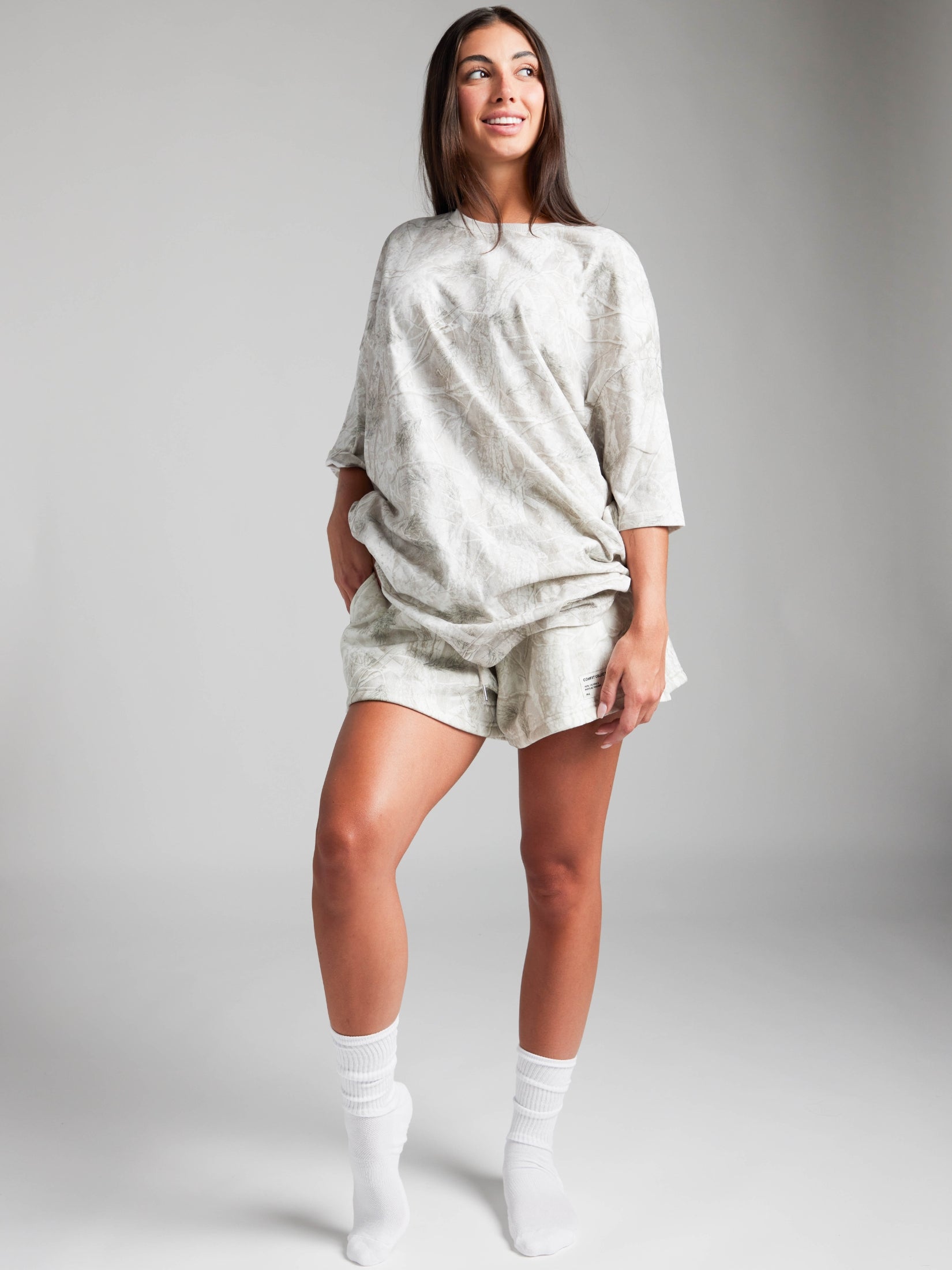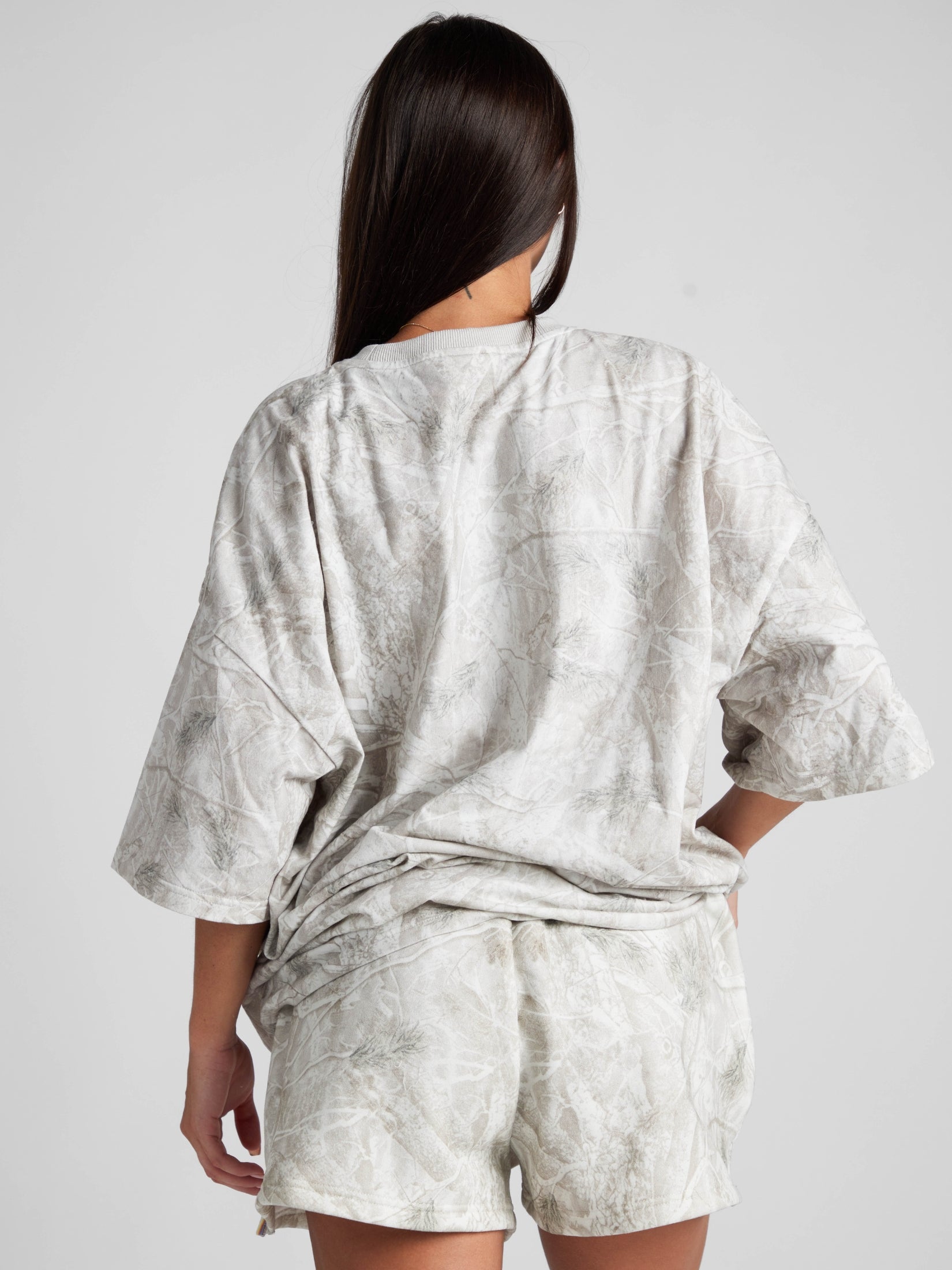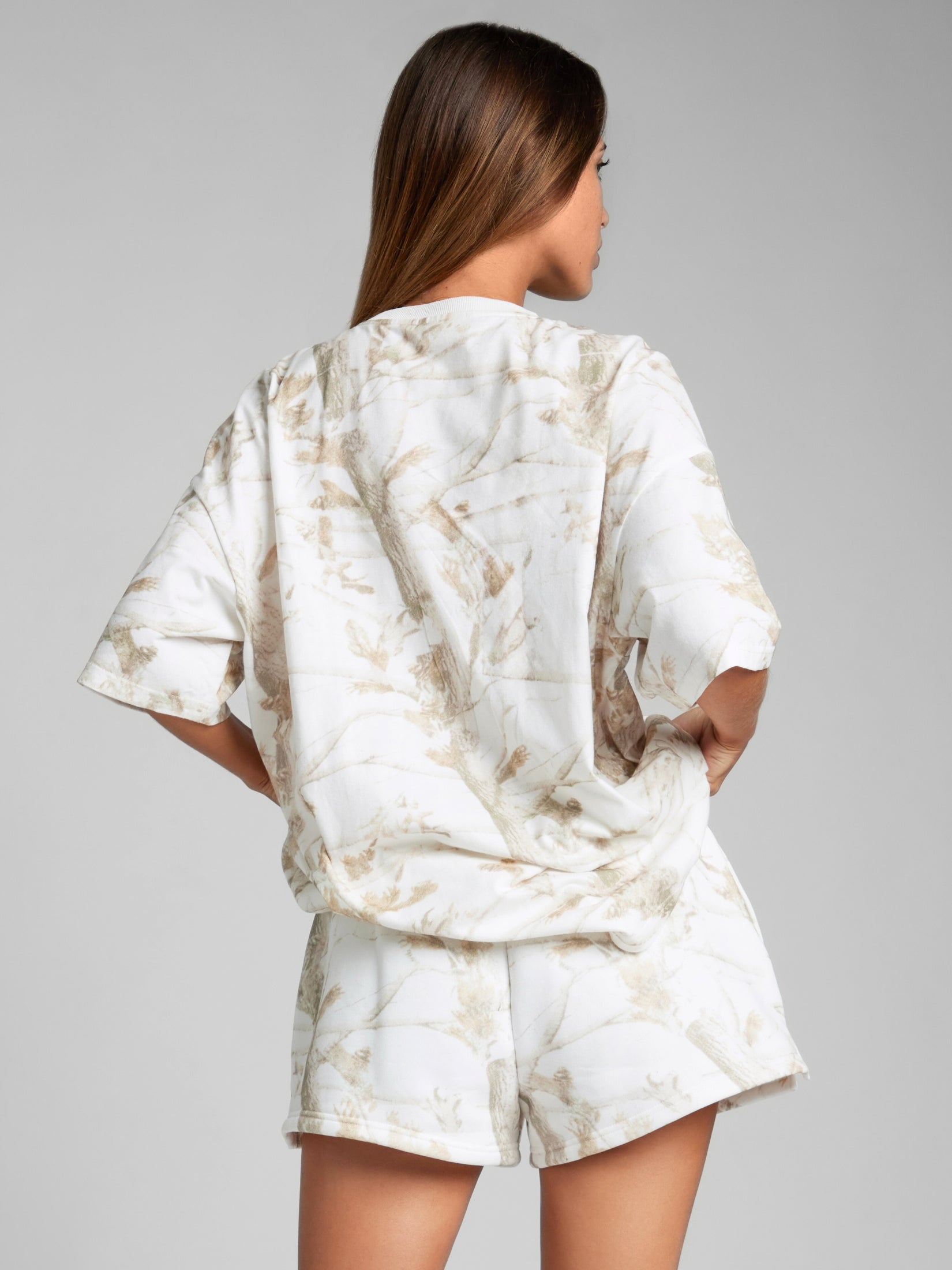 Blending comfort with the calming essence of the outdoors, our heavyweight oversized tee features a nature-inspired camo print designed to reflect your connection to the wild. Made from ultra-soft, breathable cotton Jersey, this tee is crafted to be the most comfortable piece in your closet. Its relaxed, oversized fit and cozy weight make it perfect for slow mornings, quiet walks, or unwinding at home. Each piece is enzyme-washed for cloud-like softness and long-lasting quality—no shrinkage, just pure Comfrt.